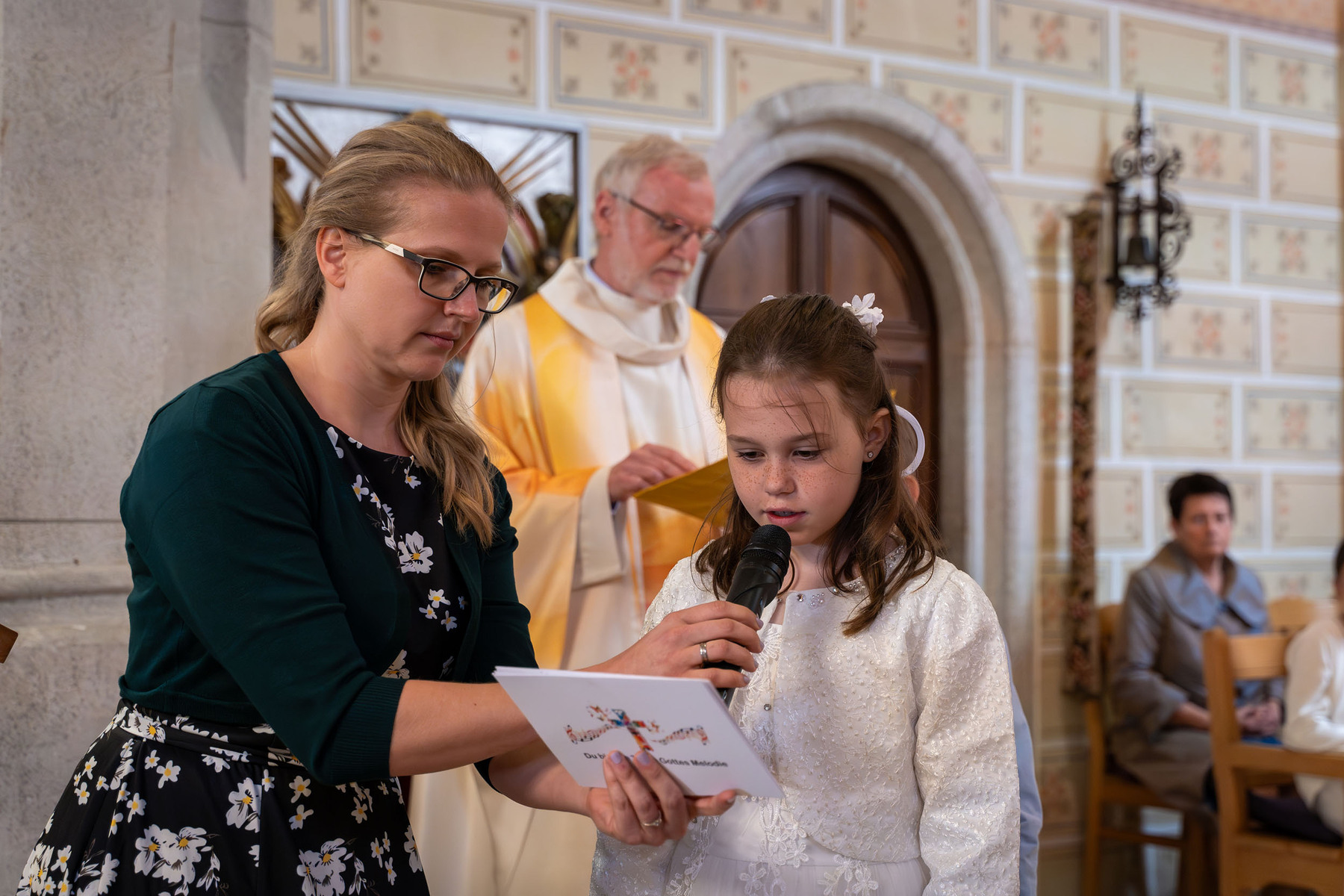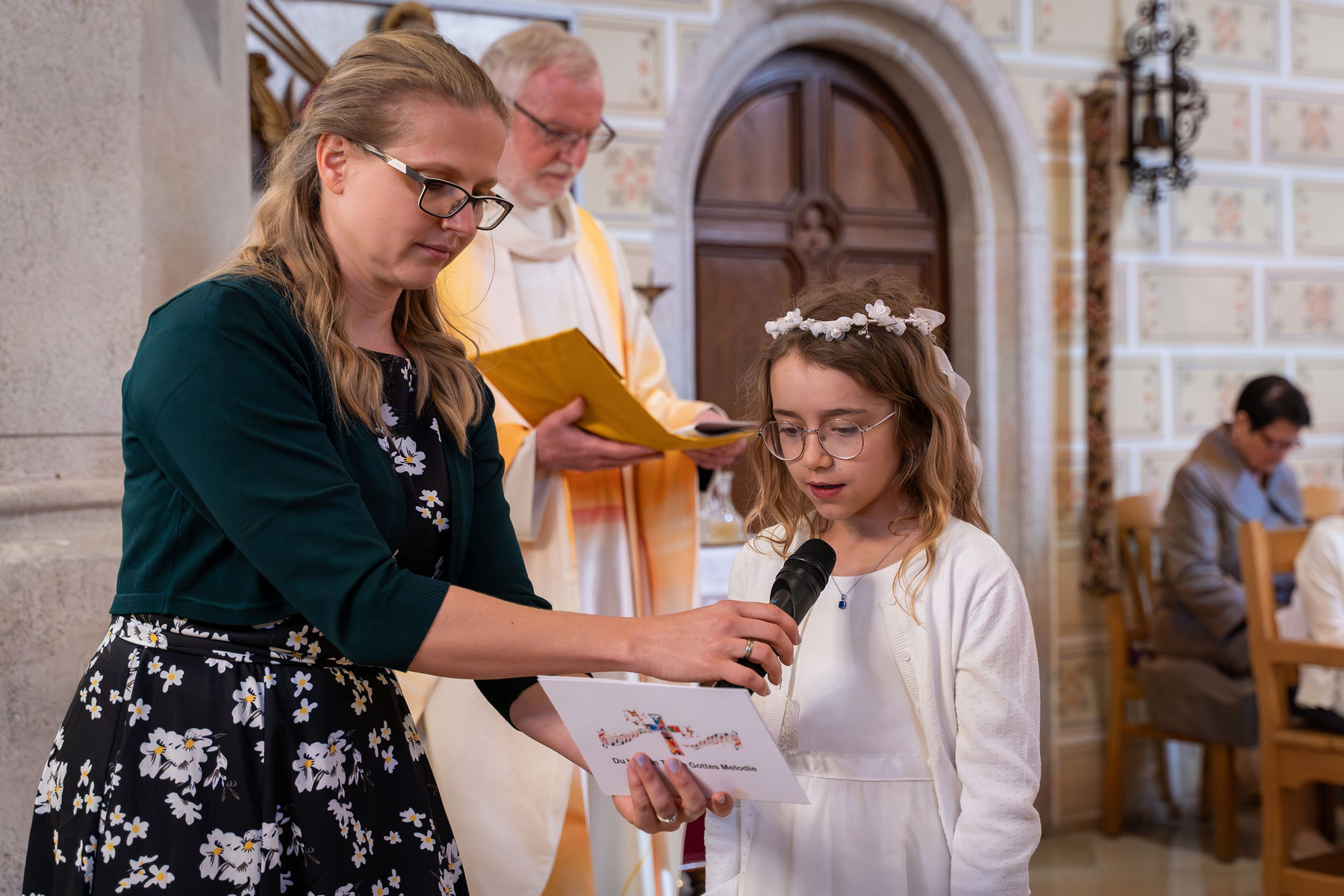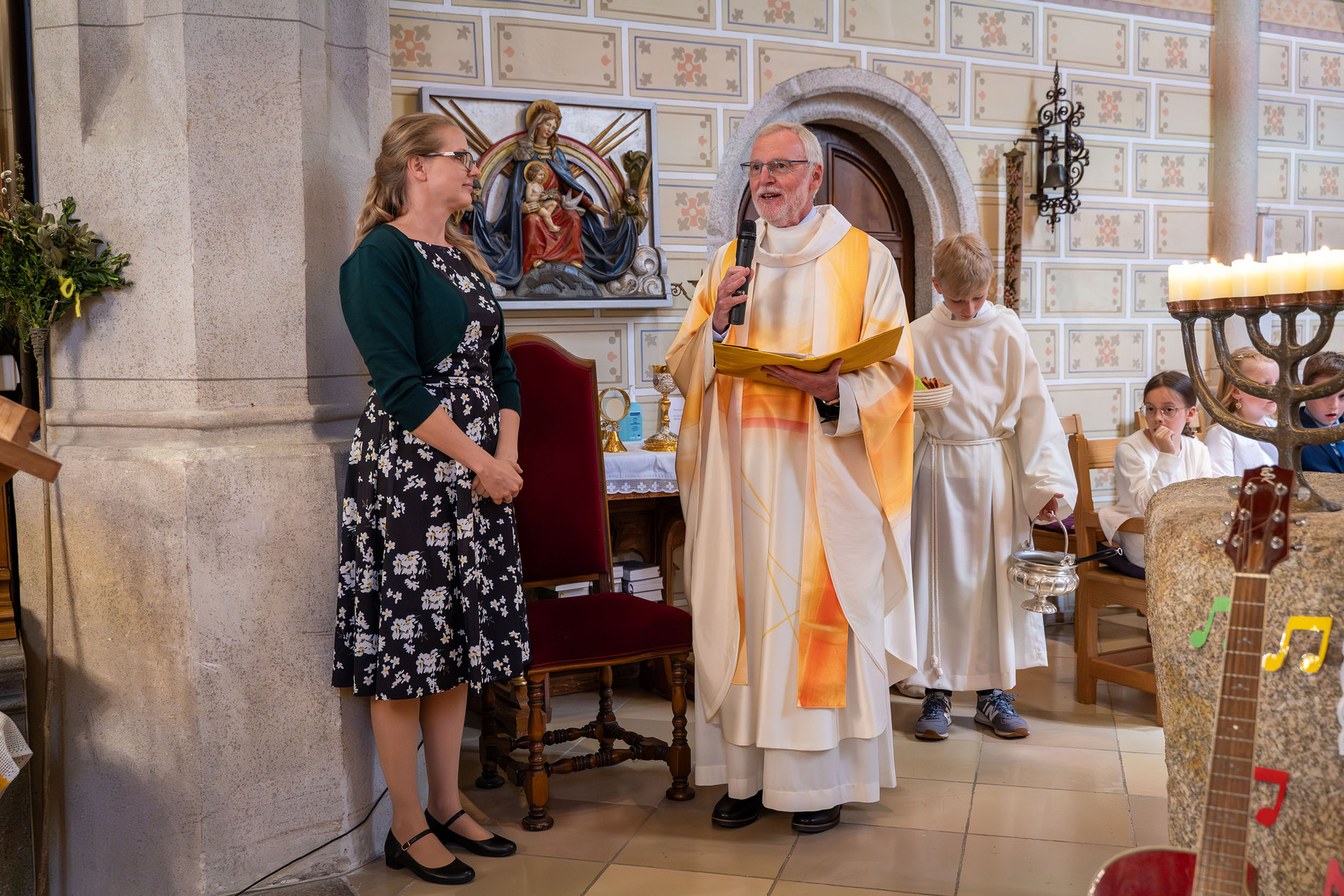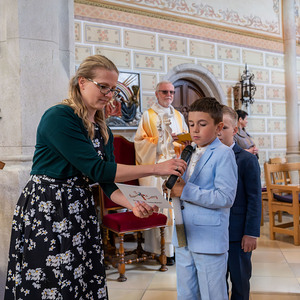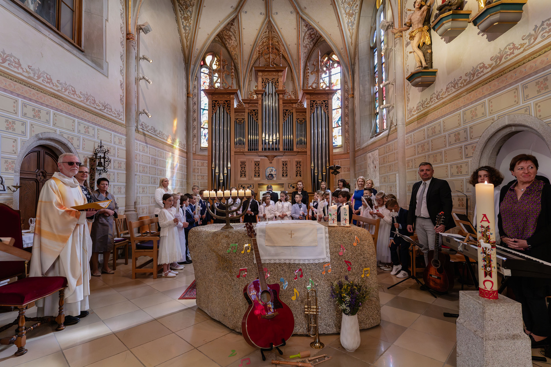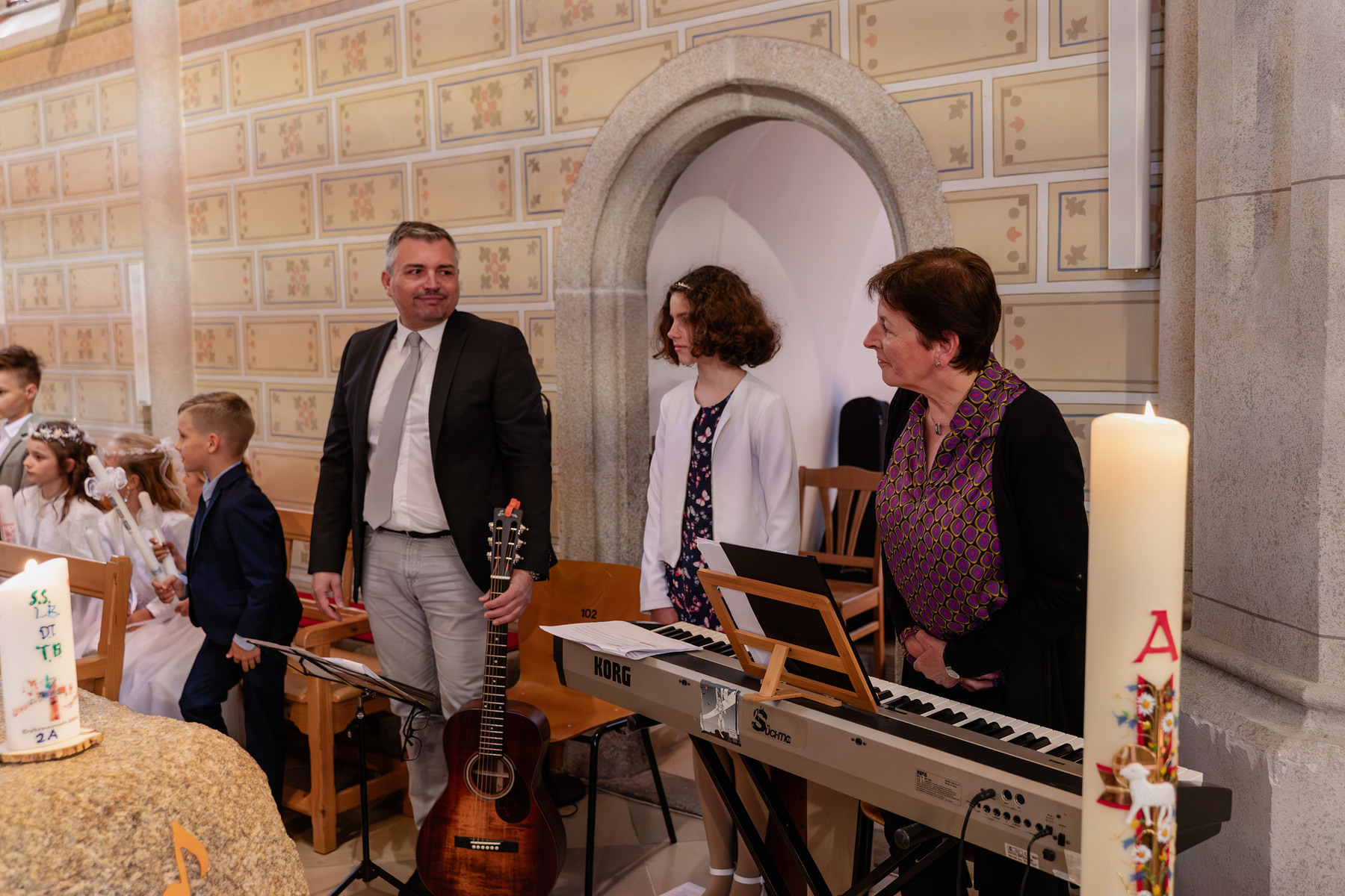 So konnte man nun am Samstag bei der Erstkommunion unter dem Motto „Du bist ein Ton in Gottes Melodie“ das toll gesungene gleichnamige Lied von den Kindern mit der musikalischen Unterstützung von Andrea Wögerer (Klavier), Christoph Leitner (Gitarre) und Lea Glemba (Cajon) zu Beginn hören.